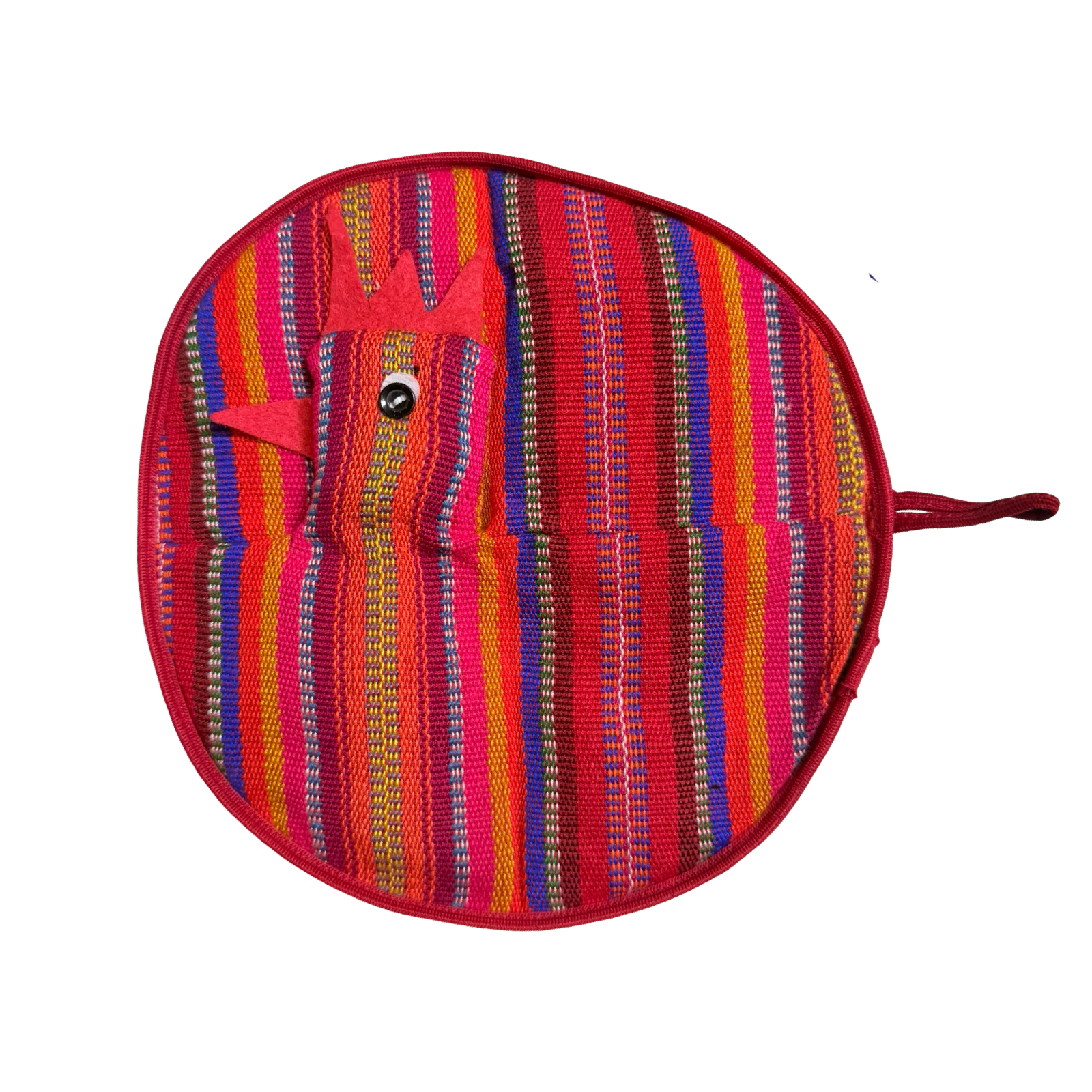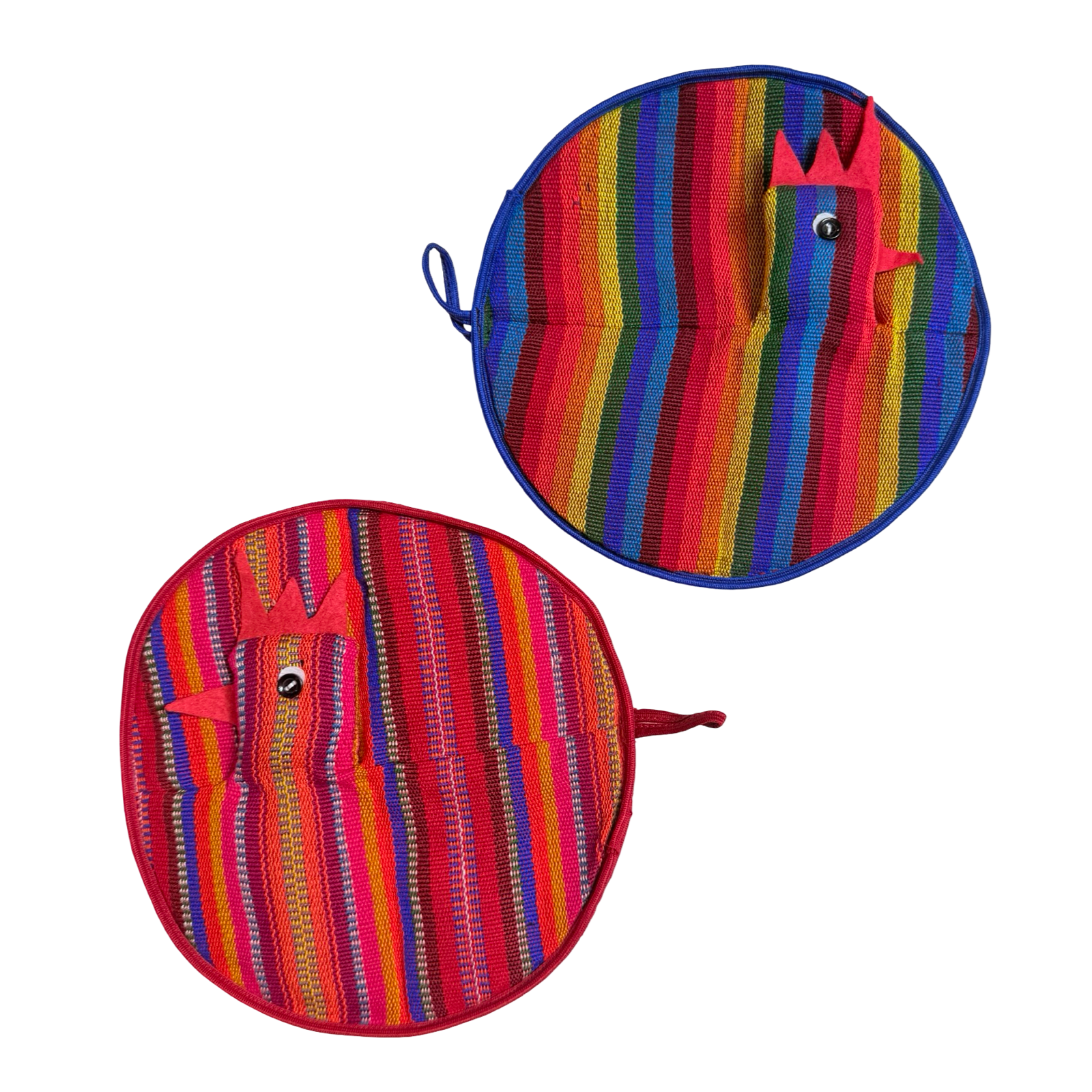 Bring a little fun to your kitchen with these round, chicken-shaped potholders feature bold, serape-style stripes and playful comb-and-beak details. Use them to grab hot pans, serve as quick trivets, or simply hang as cheerful décor.