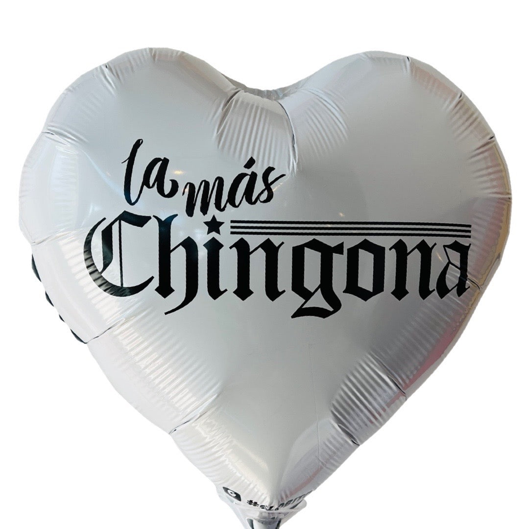 Heart shaped balloon in white that reads, "La Mas Chingona." Font is black.