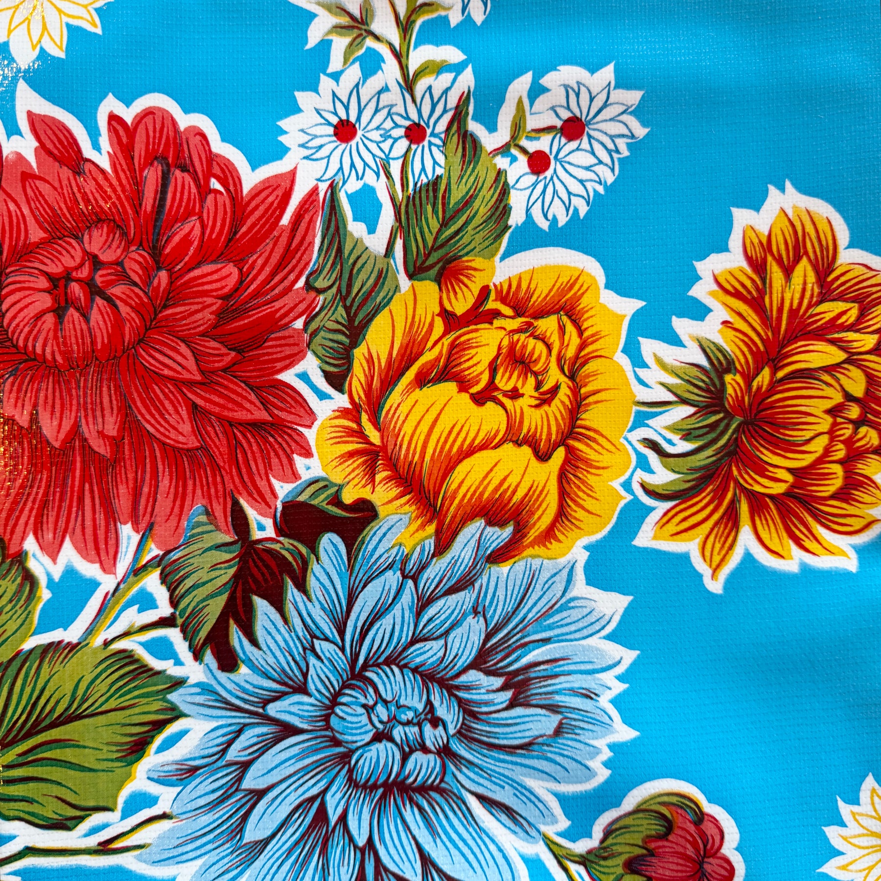 Add a whimsical pop of color to your home with this vibrant, oilcloth table cover. This pattern features beautifully designed large chrysanthemums and is one of the oldest and most intricate prints. Splendid blooms make this a classic. The durable oilcloth material resists spills and stains, making it both decorative and practical for everyday use.
